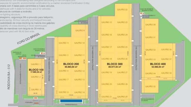 O projeto aprovado possui 38 galpões, cada um com aproximadamente 5.998 m², com infraestrutura completa para operações logísticas de grande porte. A área externa inclui 72 vagas para caminhões em espera, 164 vagas para veículos e pátio de manobras com 30 metros de largura. A previsão de ocupação é para até 2.400 funcionários, com infraestrutura de apoio dedicada aos motoristas.