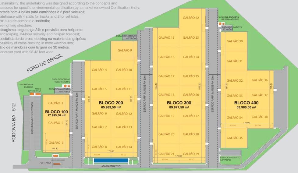 A maioria dos galpões permite operação em cross-docking. Além disso, o projeto foi desenvolvido com foco em sustentabilidade, seguindo critérios para certificação ambiental por uma entidade reconhecida no mercado.