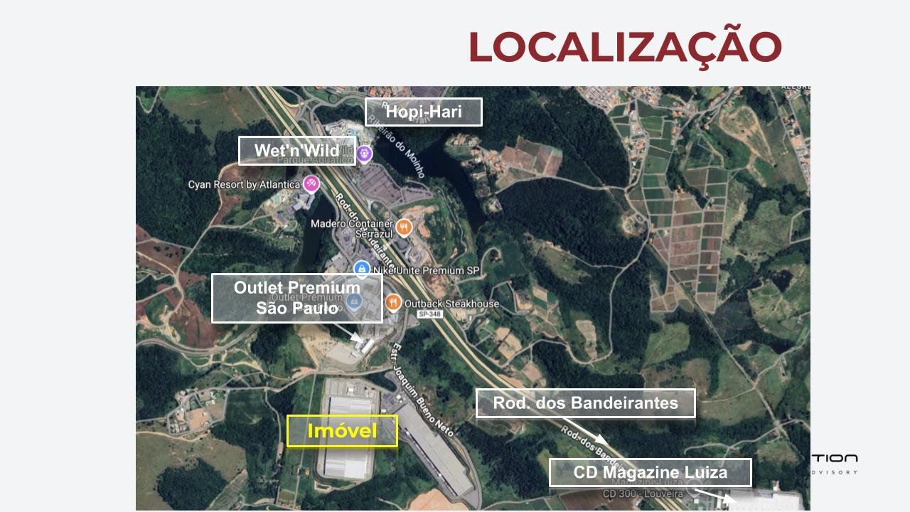 Galpão em condomínio de padrão Classe AAA, com infraestrutura completa: rede de sprinklers, auditório/sala de reuniões e segurança 24h. Cada módulo conta com 5 docas. Localizado a 72 km de São Paulo, na região metropolitana de Jundiaí, com acesso direto à Rodovia dos Bandeirantes (Km 70), a 30 km de Campinas e próximo ao Aeroporto de Viracopos (~26 km), Rodoanel e principais rodovias. Ideal para operações logísticas distribuídas entre grandes centros urbanos.