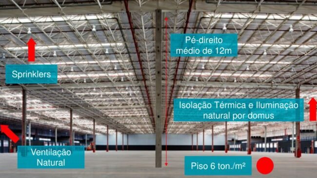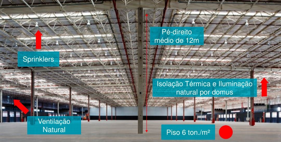 Trata-se de um galpão logístico moderno, com pé-direito médio de 12 metros e piso com capacidade para suportar até 6 toneladas por metro quadrado. O imóvel conta com iluminação natural e isolamento térmico por domus, além de ventilação natural com seis trocas de ar por hora. Possui sistema de combate a incêndio por sprinklers em todos os galpões, poço artesiano e infraestrutura completa de segurança, incluindo portaria blindada, vigilância 24 horas e monitoramento por CFTV. Oferece amplo estacionamento para 234 veículos, 26 carretas e 22 caminhões tipo VUC. Conta ainda com restaurante interno, área para eventos e certificação ambiental LEED.