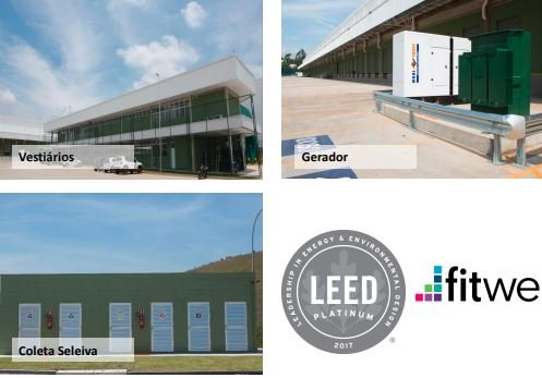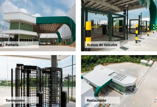 Sistema de entrada com QR Code, controle de acesso para usuários e visitantes, 3 vias para veículos com cancelas e bollards, 2 torniquetes para pedestres e restaurante com capacidade para 120 pessoas por turno.